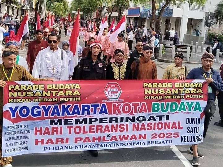 Caption : PNIB Gelar Parade Budaya dan Kirab Merah Putih sekaligus serukan 16 November sebagai Hari Toleransi Nasional di Kawasan Malioboro, Minggu (16/11/25).