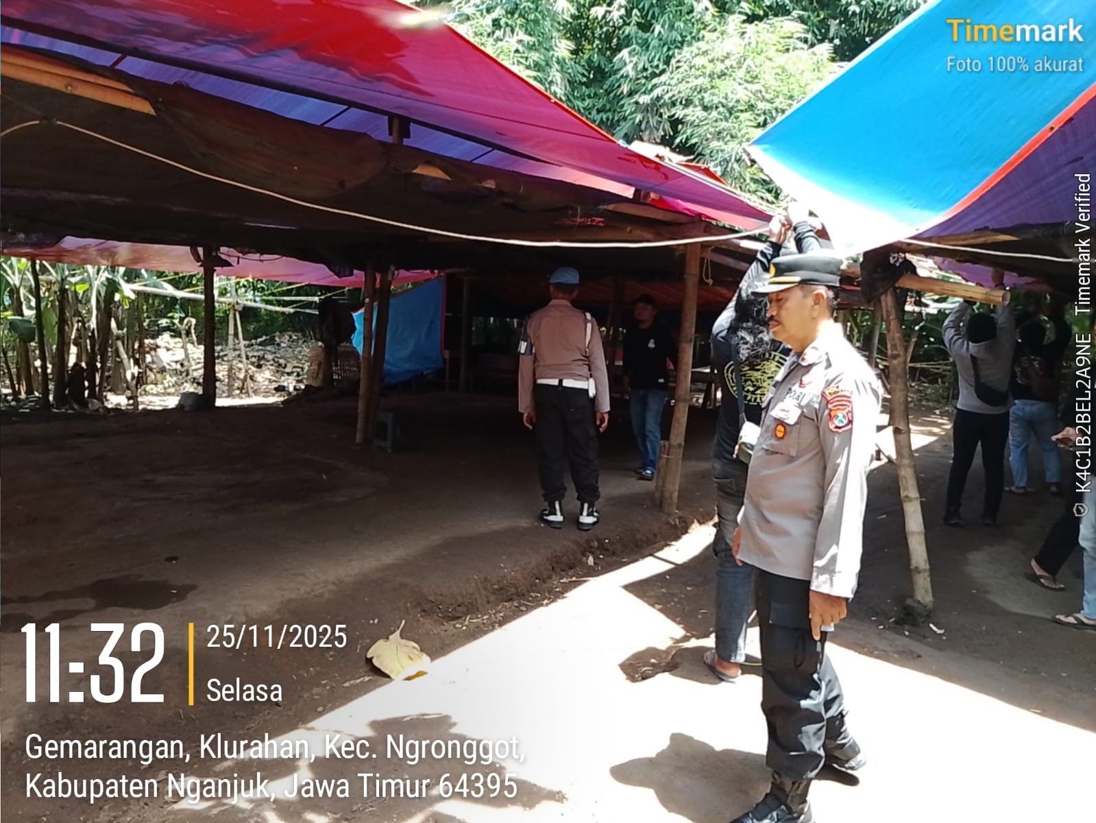 Caption :Unit Resmob Satreskrim Polres Nganjuk bersaman personel Polsek Ngronggot Bongkar Lokasi Diduga Perjudian Sabung Ayam di Klurahan,Selasa(25/11/25).