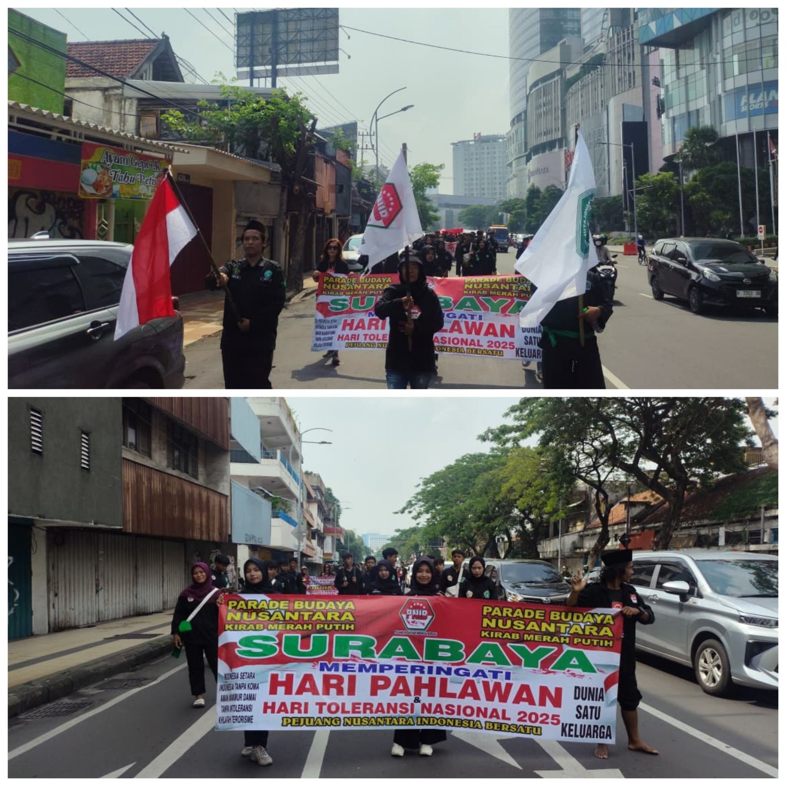 Caption : PNIB bersama PN Nyawiji Surabaya,BEM PTNU DAN FMPN Jawa Timur gelar Kirab Merah Putih dan Parade Budaya dalam Peringati Hari Pahlawan dan Hari Toleransi Nasional di kawasan Hotel Yamato (Hotel Majapahit),Minggu(30/11/25).