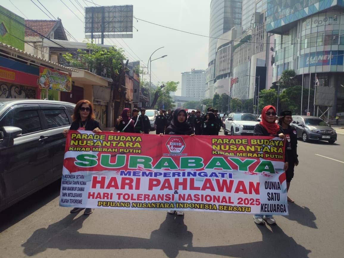 SURABAYA /JATIM , ASPIRANEWS.ID – Pejuang Nusantara Indonesia Bersatu (PNIB) bersama PN Nyawiji Surabaya, BEM PTNU, dan Forum Mahasiswa Pagar Nusa (FMPN) Jawa Timur menggelar Kirab Merah Putih dan Parade Budaya Nusantara untuk memperingati Hari Pahlawan dan Hari Toleransi Nasional, Minggu (30/11). Kirab dimulai dari Taman Apsari dan berakhir di kawasan bersejarah Hotel Yamato (Hotel Majapahit) dengan doa bersama untuk para pejuang 10 November 1945, Minggu (30/11/25).