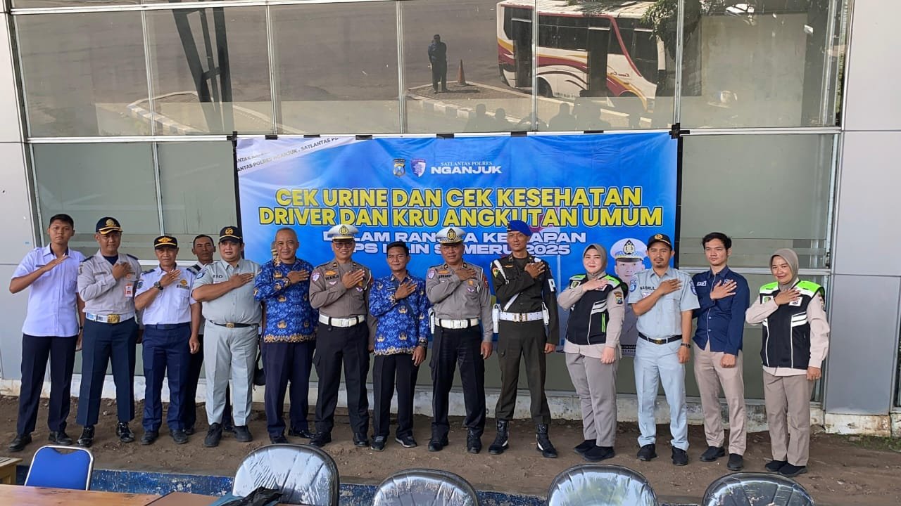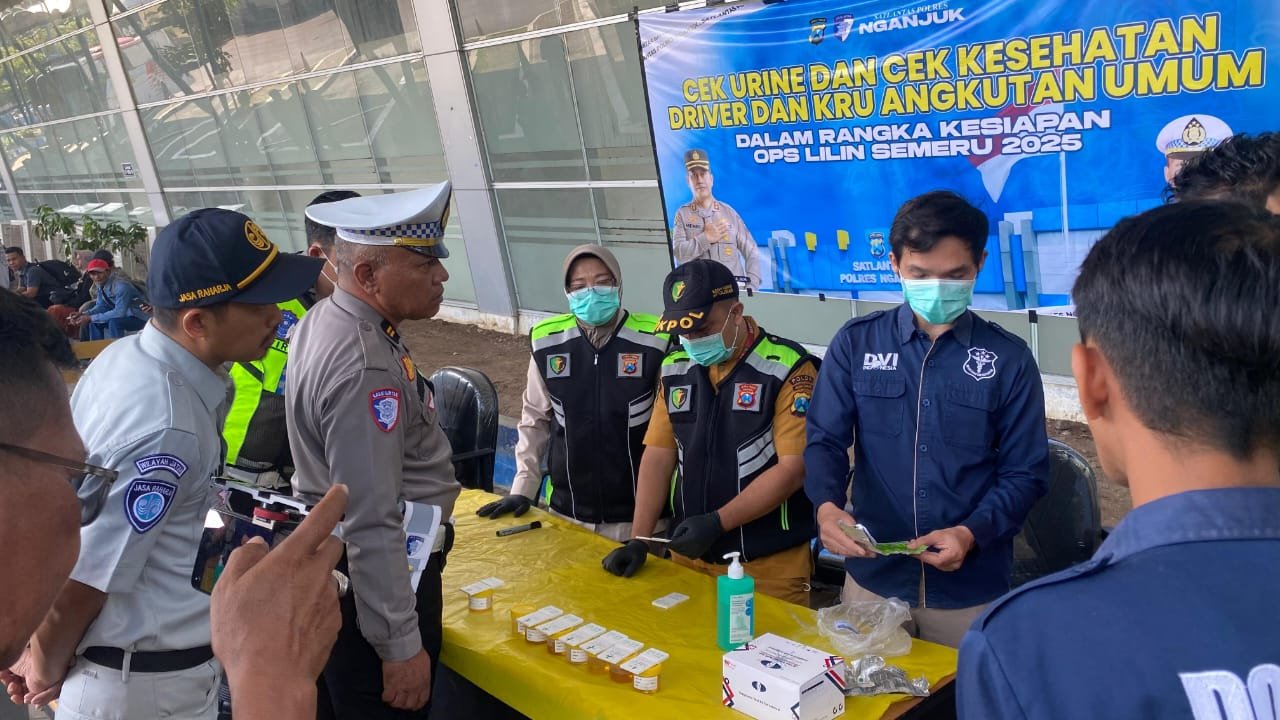 Polres Nganjuk melalui Satuan Lalu Lintas dan Seksi Kedokteran dan Kesehatan (Sidokkes) menggelar pemeriksaan urin dan cek kesehatan bagi driver serta kru angkutan umum dalam rangka kesiapan Operasi Lilin Semeru 2025. Kegiatan ini dipusatkan di Terminal Bus Anjuk Ladang dengan prioritas utama armada bus yang melintas di wilayah Kabupaten Nganjuk, Rabu pagi (17/12/2025).