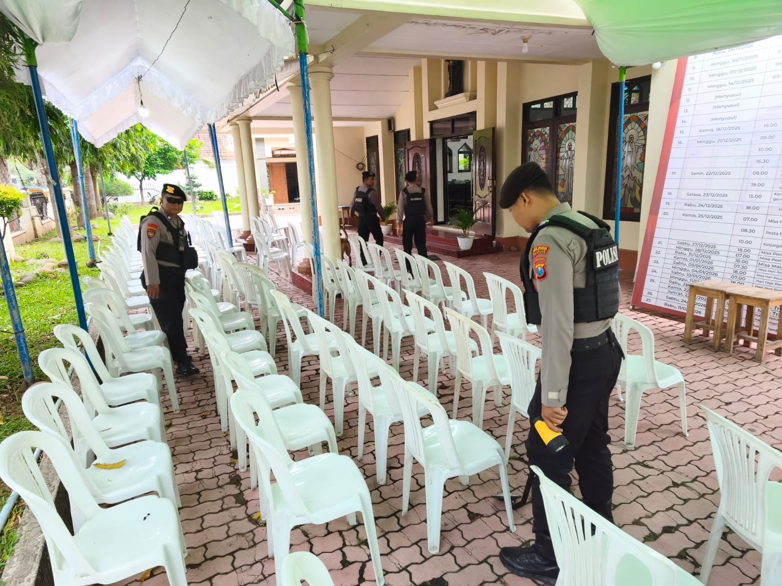 “Pemeriksaan dilakukan pada pintu masuk, area altar, bangku jemaat, hingga halaman gereja. Unit K9 kami terjunkan untuk mendeteksi kemungkinan adanya bahan berbahaya, sementara metal detector digunakan sebagai langkah pendukung,” jelasnya.