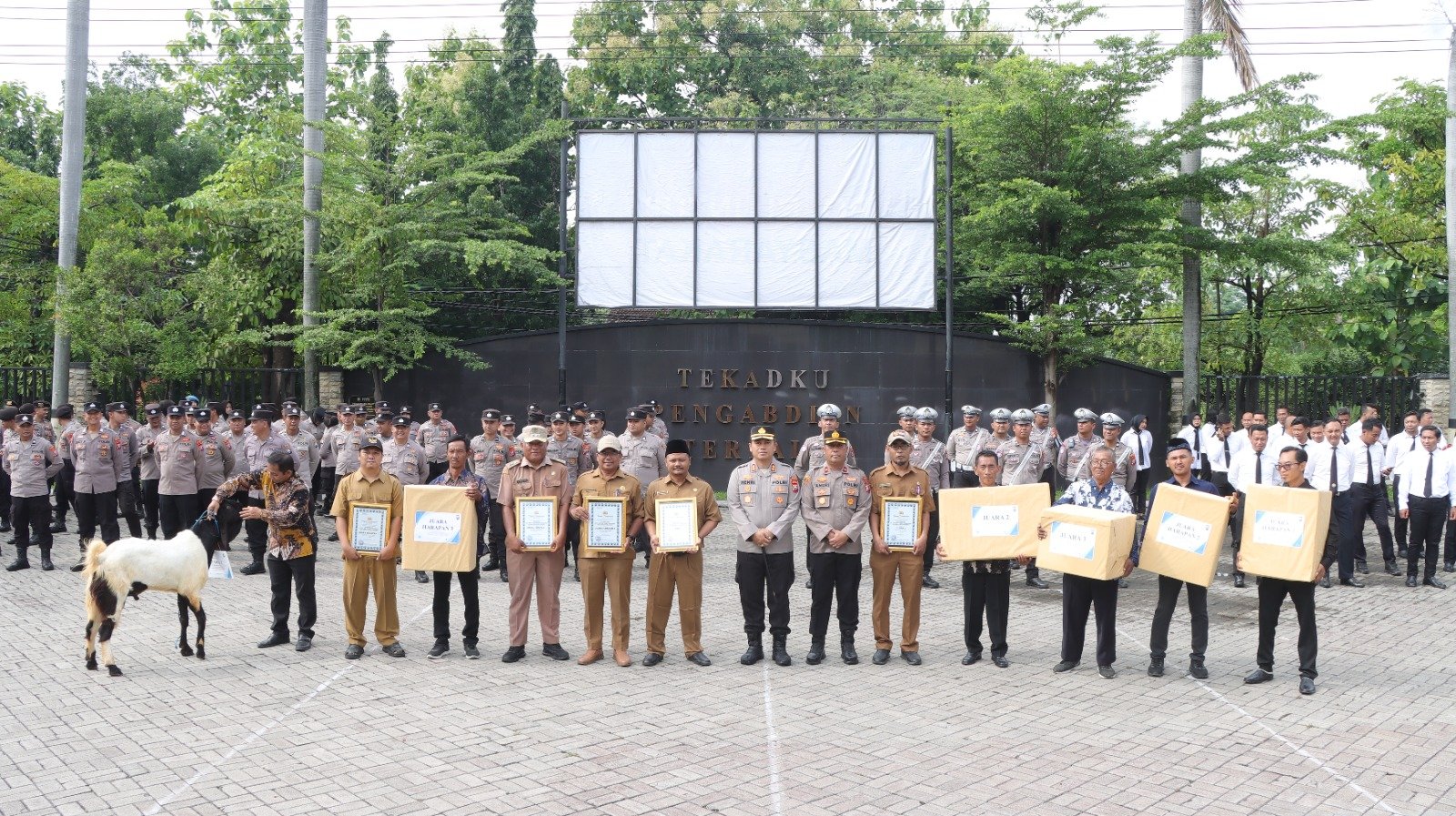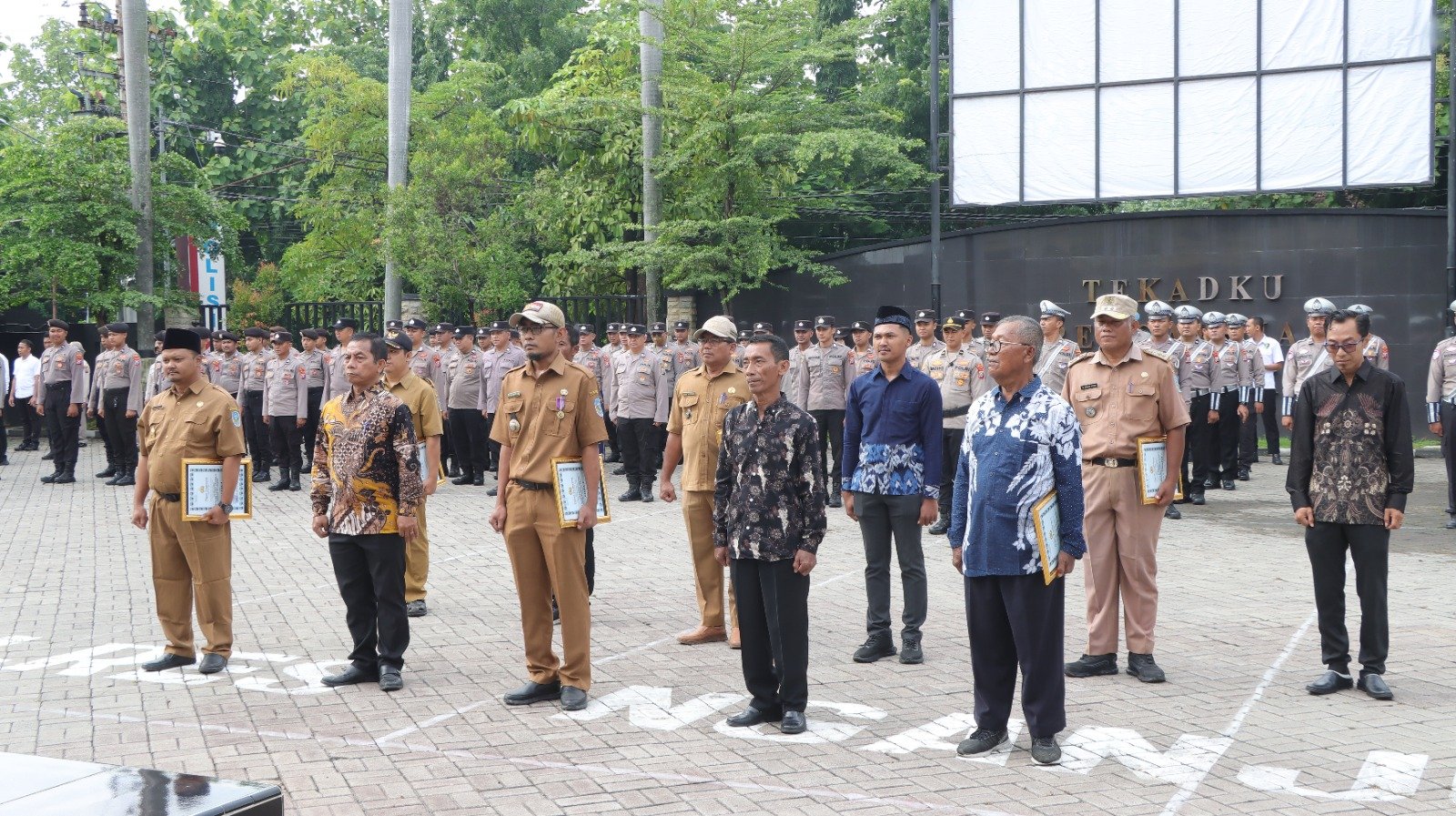 Polres Nganjuk menyerahkan hadiah kepada para pemenang Lomba Siskamling jajaran Polres Nganjuk dalam Apel Jam Pimpinan yang dipimpin langsung Kapolres Nganjuk AKBP Henri Noveri Santoso, S.H., S.I.K., M.M., di Lapangan Apel Polres Nganjuk, Senin (5/1/2026). Upacara tersebut diikuti Wakapolres Nganjuk, para pejabat utama (PJU), para perwira, anggota, serta ASN Polri.