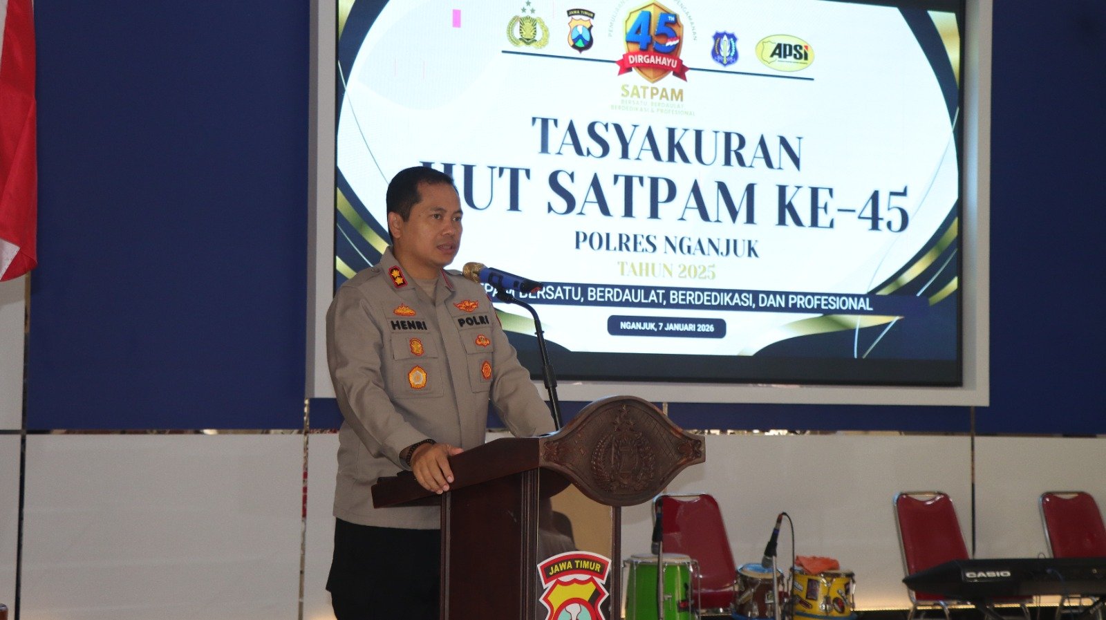 Polres Nganjuk menggelar acara tasyakuran Hari Ulang Tahun (HUT) Satuan Pengamanan (Satpam) ke-45 Tahun 2026 dengan tema “Satpam Bersatu, Berdaulat, Berdedikasi dan Profesional” yang berlangsung di Aula Tantya Sudhirajati Polres Nganjuk. Kegiatan tersebut dihadiri Kapolres Nganjuk bersama jajaran serta perwakilan Satpam dari berbagai instansi dan perusahaan, Rabu (07/01/2026).