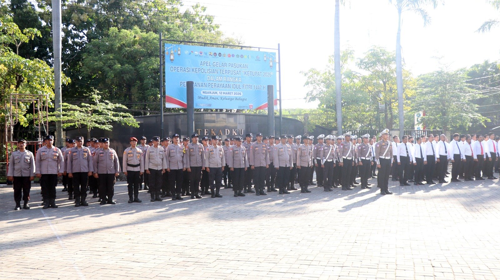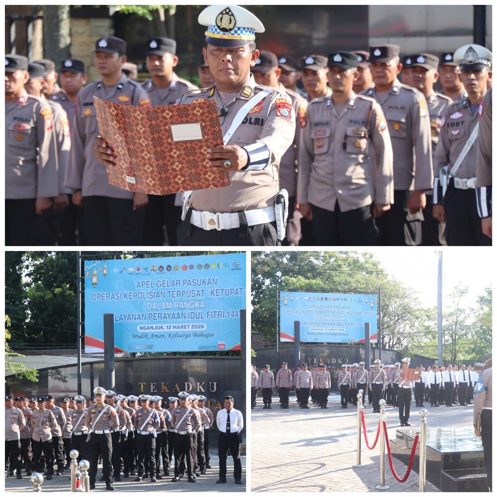 Polres Nganjuk menggelar Apel Gelar Pasukan Operasi Ketupat Semeru 2026 di lapangan apel Polres Nganjuk Apel tersebut diikuti pasukan gabungan dari TNI-Polri, Dinas Perhubungan, Satpol PP, BPBD, Dinas Kesehatan, Damkar, ORARI, Senkom serta Pramuka sebagai bentuk kesiapan pengamanan arus mudik dan perayaan Idul Fitri 1447 H, Kamis (12/3/2026).